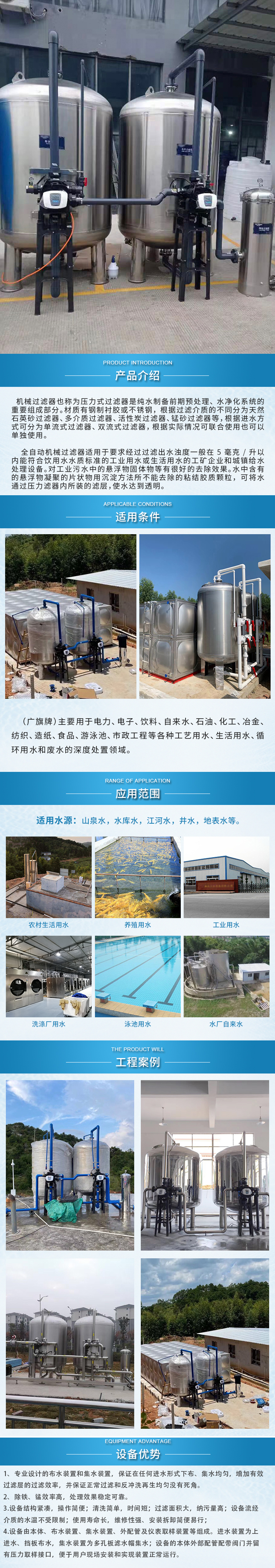機械過濾器也稱為壓力式過濾器是純水制備前期預處理、水凈化系統(tǒng)的重要組成部分。材質有鋼制襯膠或不銹鋼,根據(jù)過濾介質的不同分為天然石英砂過濾器、多介質過濾器、活性炭過濾器、錳砂過濾器等,根據(jù)進水方式可分為單流式過濾器、雙流式過濾器,根據(jù)實際情況可聯(lián)合使用也可以單獨使用。