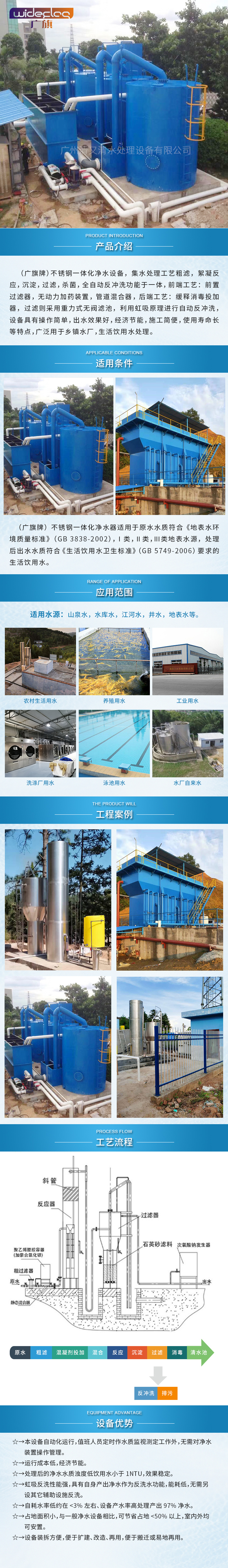 (廣旗牌)不銹鋼一體化凈水設(shè)備,集水處理工藝粗濾,絮凝反應(yīng),沉淀,過濾,殺菌,全自動(dòng)反沖洗功能于一體,前端工藝:前置過濾器,無動(dòng)力加藥裝置,管道混合器,后端工藝:緩釋消毒投加器,過濾則采用重力式無閥濾池,利用虹吸原理進(jìn)行自動(dòng)反沖洗,設(shè)備具有操作簡單,出水效果好,經(jīng)濟(jì)節(jié)能,施工簡便,使用壽命長等特點(diǎn),廣泛用于鄉(xiāng)鎮(zhèn)水廠,生活飲用水處理。